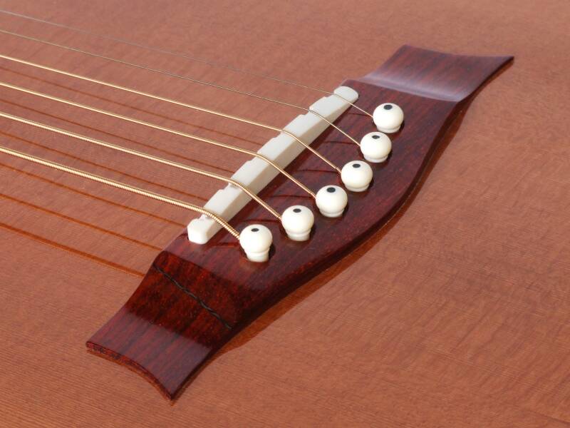Carbon Fibre Reinforced Bridges A guitar’s bridge is more than just the place where the strings terminate. It is an integral part of the bracing structure of the guitar top, though most people don’t think of it in that way. It is a significant mass (most bridges are made of ebony or rosewood) and on some designs a significant stiffness. The sound produced by a guitar is dependent upon the acceleration of the bridge. More acceleration=more sound. Low mass bridges accelerate more under the oscillatory string forces. My bridges are ultra low mass, generally made of non-conventional woods (i.e. seldom of ebony or rosewood because they are dense woods) and are reinforced with carbon fibre for strength and stiffness. My bridges are typically less than half the mass of other makers for both classical and steel string guitars. The benefit is much more volume. RETURN |